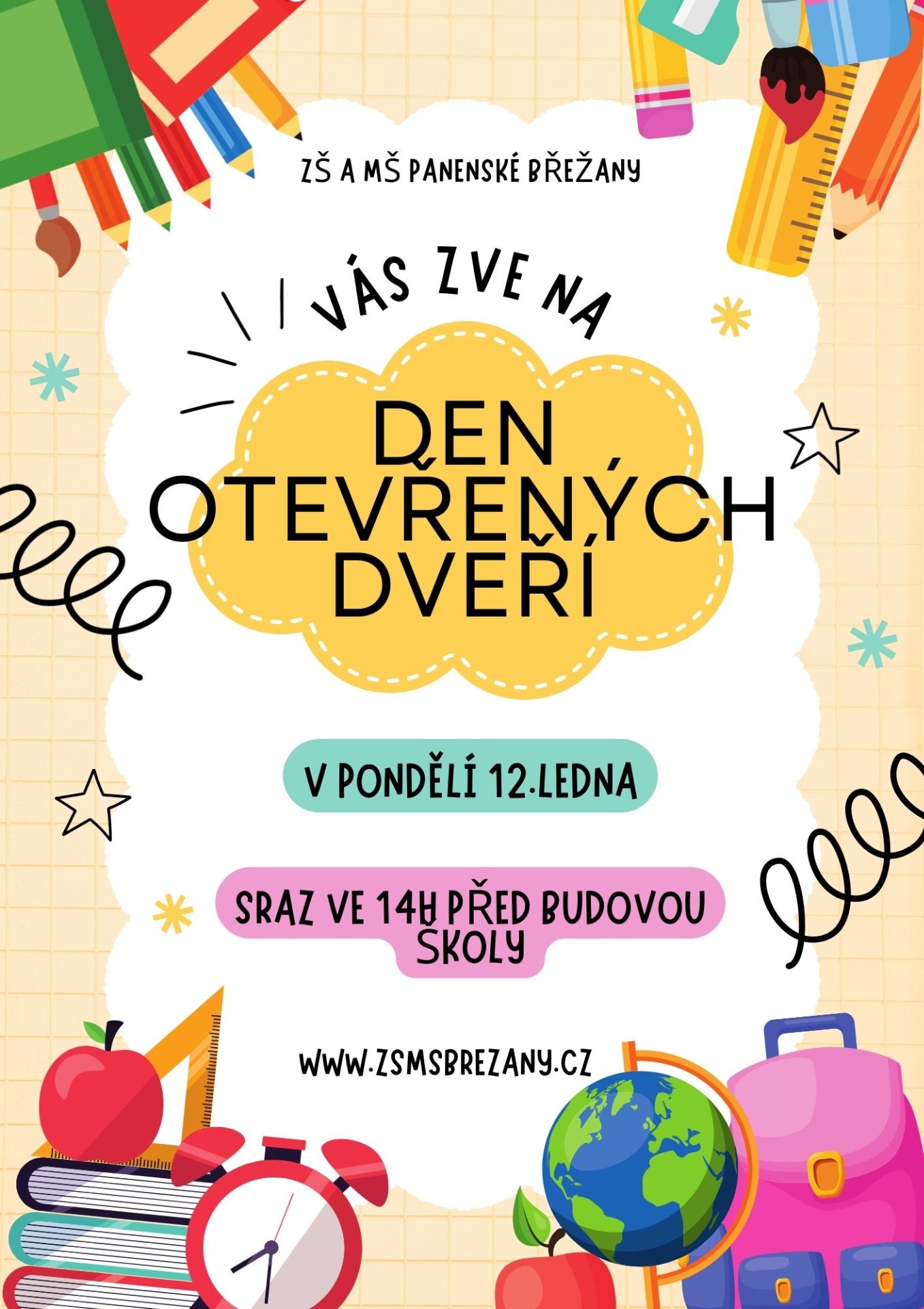 Srdečně zveme všechny zájemce na Den otevřených dveří, který se bude konat v pondělí 12. ledna. Sejdeme se ve 14:00 před budovou školy.
