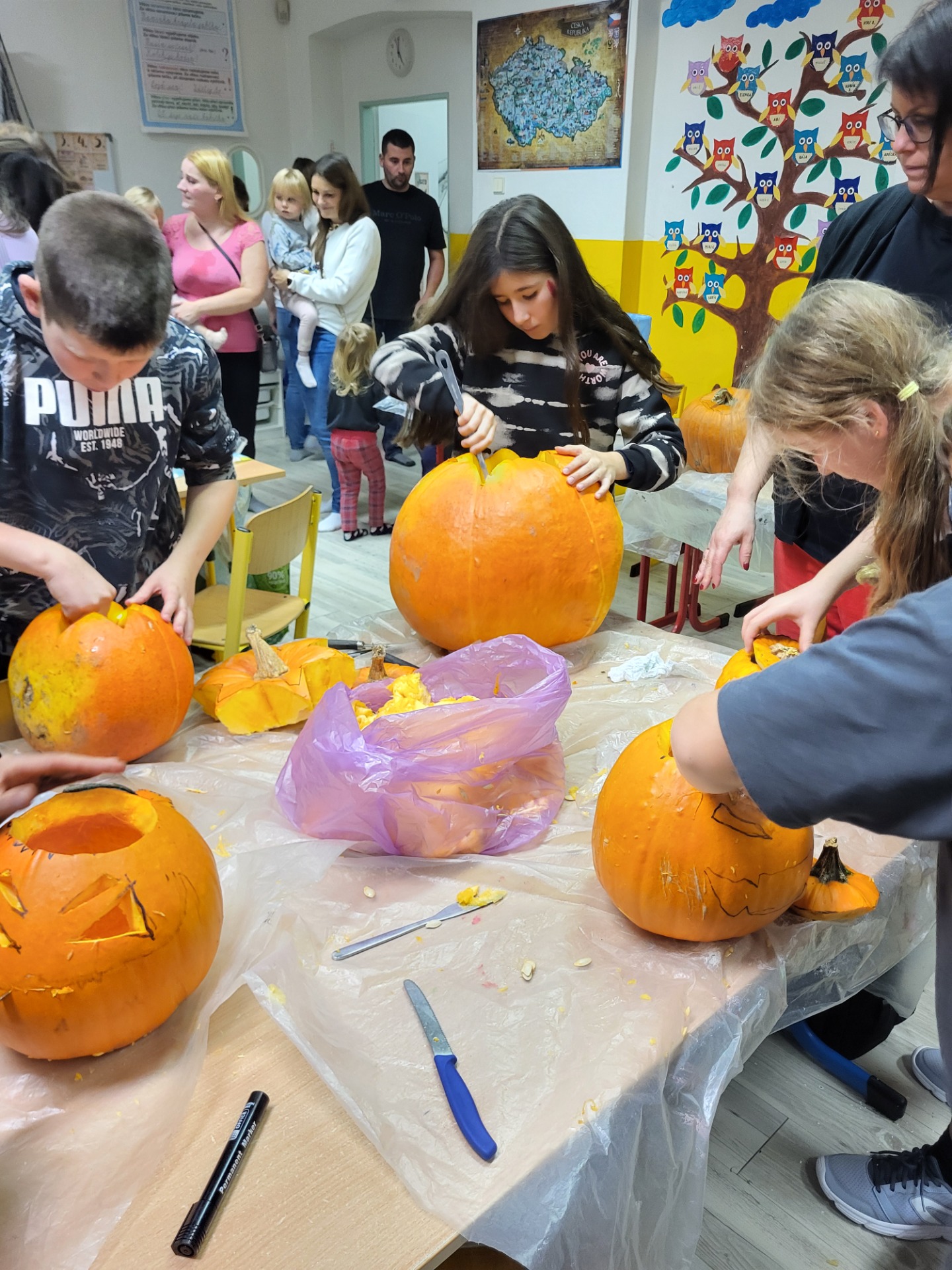 Děti spolu s rodiči vyřezávaly i zdobily dýně, které proměnily školní třídu v krásně oranžovou podzimní výzdobu.