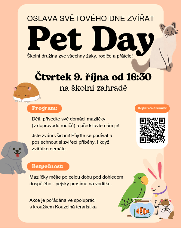 Srdečně všechny zveme na zajímavou akci s názvem Pet Day, kterou pořádá školní družina ve spolupráci s kroužkem Kouzelná teraristika.