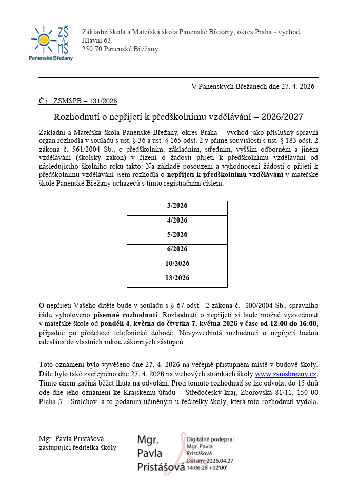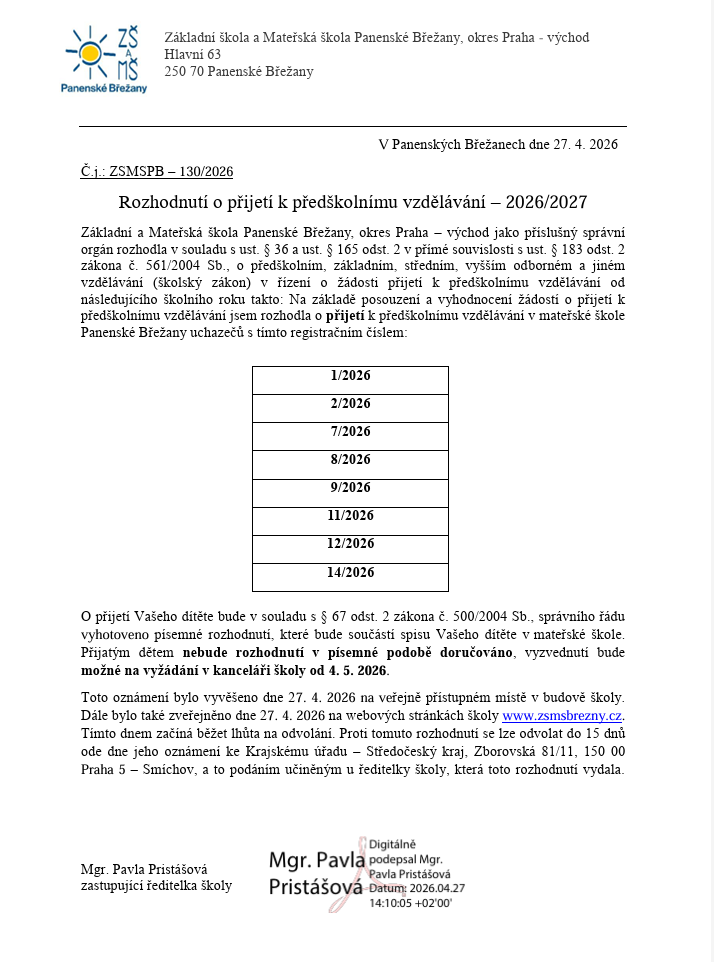 VÝSLEDKY ZÁPISU DO MATEŘSKÉ ŠKOLY PRO ŠKOLNÍ ROK 2026/2027