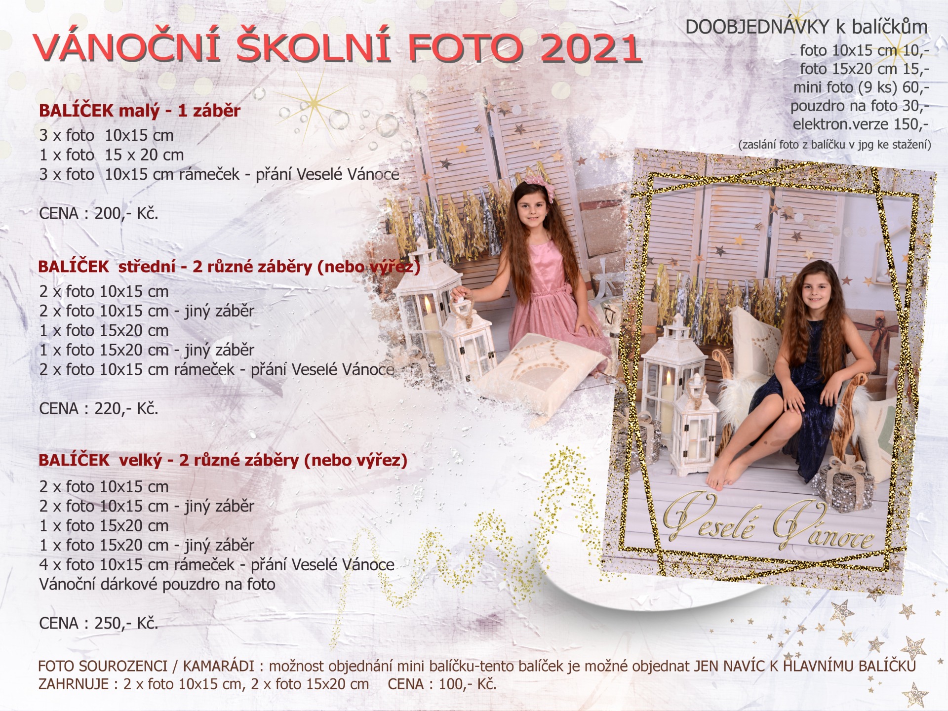 i letos jsme si pro vás připravili vánoční focení vašich dětí, které bude probíhat ve čtvrtek 1. prosince 2022 na obecním úřadě. V níže přiloženém plakátu můžete vidět ukázku fotografií. Můžete vybírat ze 3 balíčků, případně doobjednat další produkty. Objednávkový formulář je k dispozici jak na chodbě základní školy tak ve škole mateřské. Kdo se do školy nedostane, napište mi prosím email, do tabulky vás ráda napíšu.