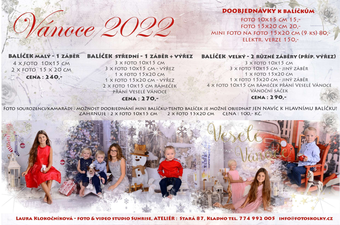 i letos jsme si pro vás připravili vánoční focení vašich dětí, které bude probíhat ve čtvrtek 1. prosince 2022 na obecním úřadě. V níže přiloženém plakátu můžete vidět ukázku fotografií. Můžete vybírat ze 3 balíčků, případně doobjednat další produkty. Objednávkový formulář je k dispozici jak na chodbě základní školy tak ve škole mateřské. Kdo se do školy nedostane, napište mi prosím email, do tabulky vás ráda napíšu.