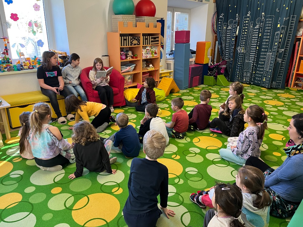 V rámci seznamování dětí s knihami k nám do školky každý den zavítali dva školáci ze třetí a čtvrté třídy, aby nám přečetli vždy jednu z klasických českých pohádek. Poslechli jsme si v jejich podání například vyprávění O Otesánkovi, Hrnečku vař nebo O Smolíčkovi. Školáci si tak vyzkoušeli, jaké je čtení někdy trochu neposednému publiku a děti ze školky se učili v klidu poslouchat, porozumět čtenému slovu a nakonec odpovědět na jednoduché otázky týkající se přečteného příběhu. Všem školákům, kteří nás ve školce navštívili, děkujeme za jejich úsilí a chvíle společně strávené nad knihou.
