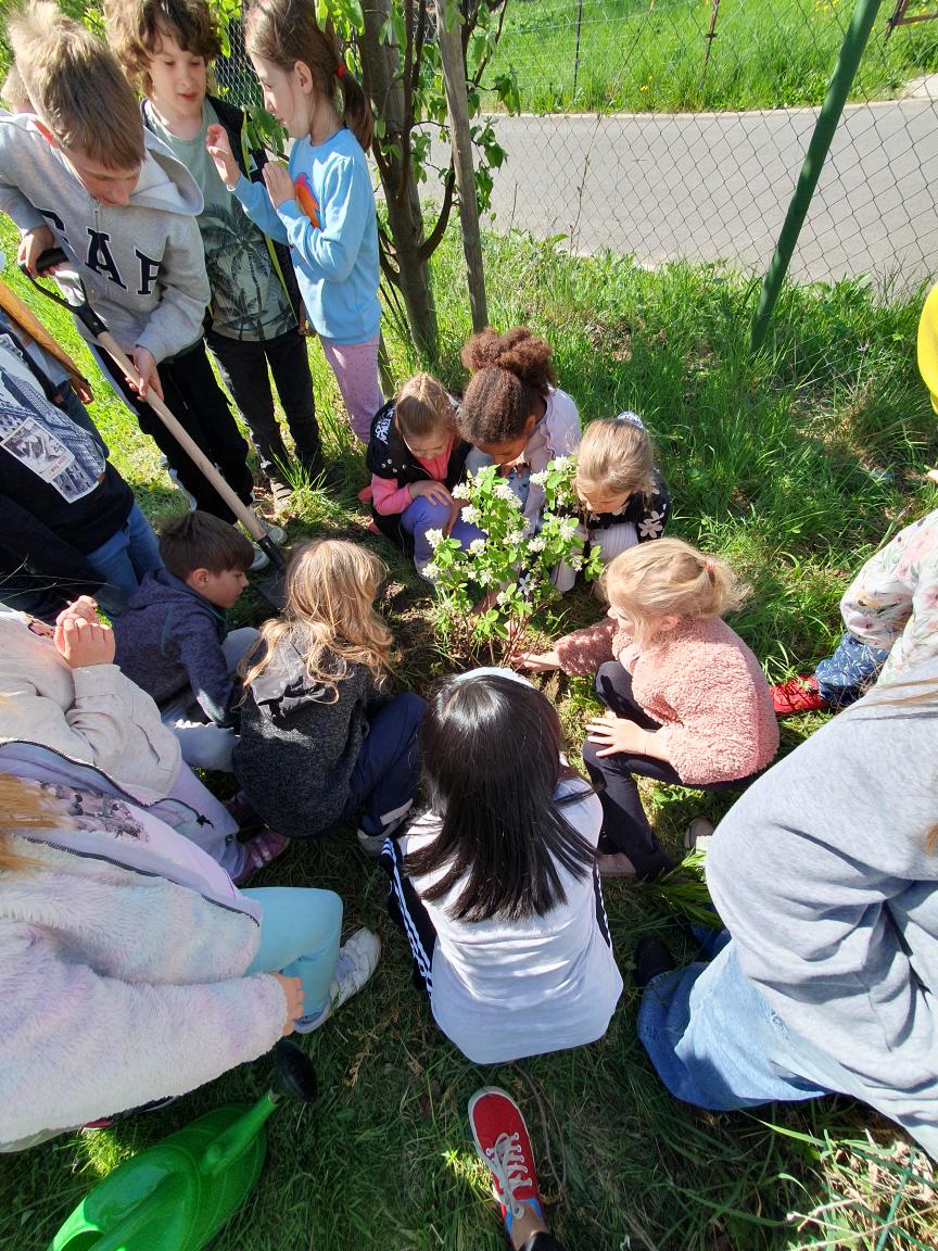 My jsme dětem u příležitosti svátku naší planety připravili zahradní bojovku pro školáky i školkáčky v podobě kvízu s environmentální tematikou. A když smíšené skupinky žáků vyluštili tajenku a dostaly odměnu, všichni jsme společně zasadili jabloň a muchovník.