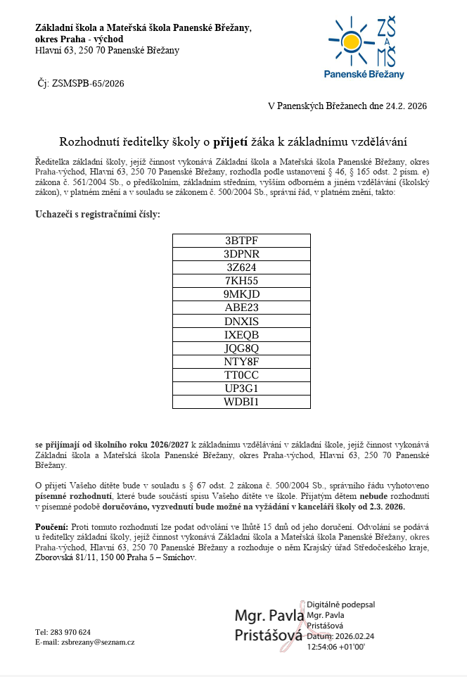 Vzhledem k novele školského zákona (platí od 1.1.2012) písemné Rozhodnutí o přijetí nedostanete (pouze na žádost - bude možné převzít v kanceláři školy). Rozhodnutí o nepřijetí k povinné školní docházce zasíláme poštou do vlastních rukou nebo do datové schránky. Po dohodě je možné rozhodnutí vyzvednout v kanceláři školy.