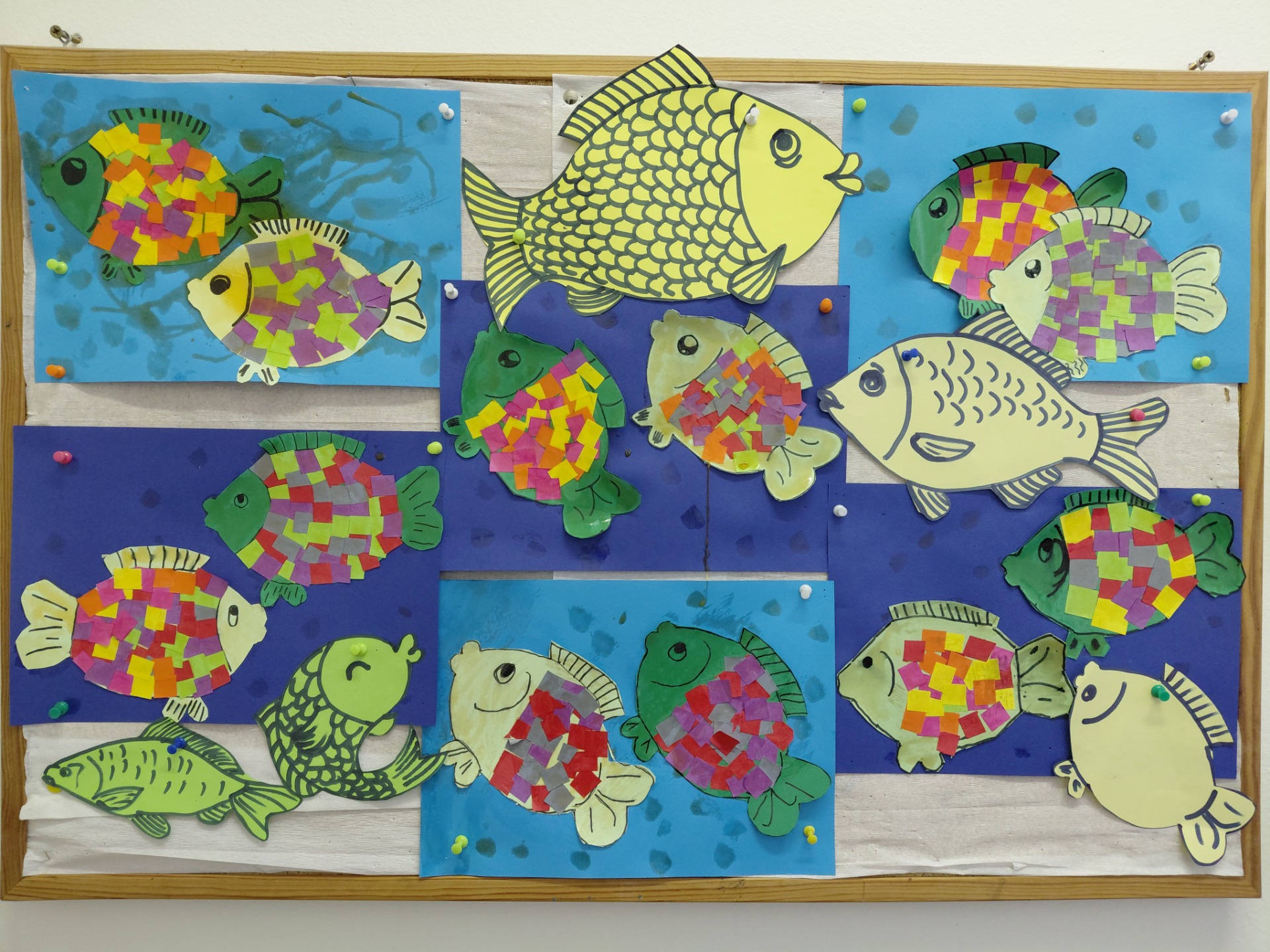 Své výtvarné nadání děti projevily i při tvoření na nástěnku barevnými křídami, čímž si zkrášlily prostory své školy.
