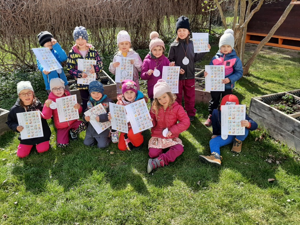na školní zahradě, při které děti hledaly ztracené velikonoční obrázky. Všechny